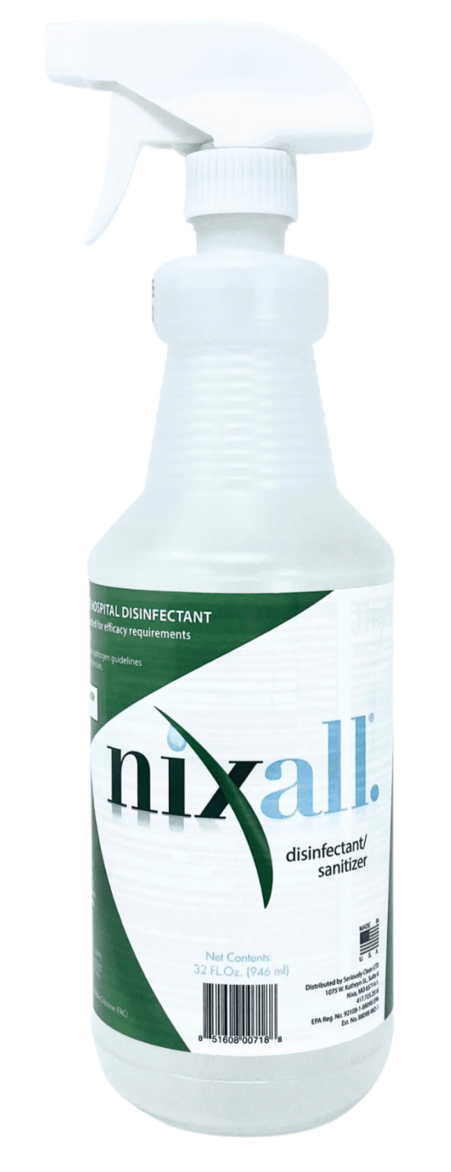 • Nixall Disinfectant/Sanitizer’s active ingredient, hypochlorous acid, HOCl, is derived from naturally occurring salt minerals and water. This clean-smelling, powerful disinfectant can be used in institutional facilities as well as your home.